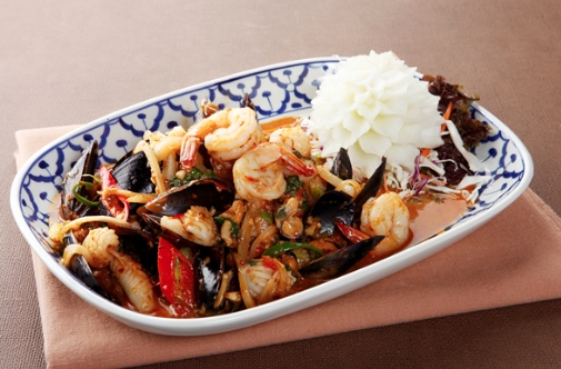 해산물볶음(25,000원) : 바지락, 홍합, 오징어, 새우 등을 매운 소스와 코코넛밀크를 넣고 볶은 요리