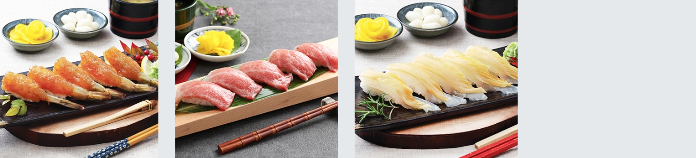 간장새우(5P, 8,500원) / 도로초밥(5P, 20,000원) / 광어묵은지초밥(5P, 9,000원)