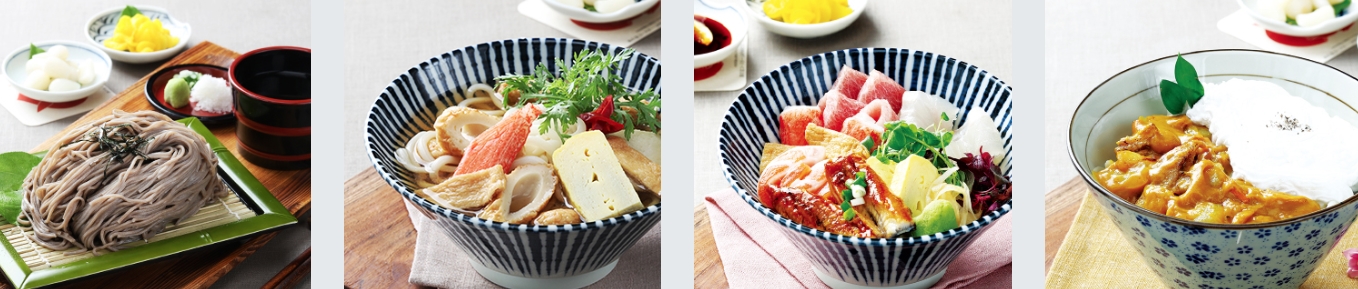 모밀소바(7,000원) / 가츠오 우동(7,000원) / 지라시 덮밥(10,000원) / 크림카레우동(10,000원)