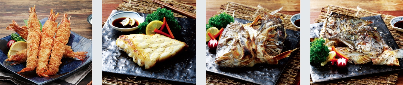 왕새우튀김(5P, 20,000원) / 메로 구이(61,000원) / 도미머리 구이(15,000원) / 연어머리 구이(15,000원)