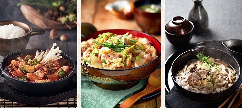 스끼야끼 : 각종 채소, 버섯, 두부등을 넣어 담백하게 끓여낸 요리. 다양하게 우동사리나 죽을 추가해서 즐기세요