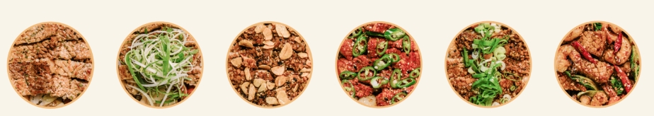취향별로 즐길 수 있는 소스를 미리 알아두세요(아래 왼쪽부터) : 오리지널 / 파 / 마늘/ 땡초 / 간장 / 마라
