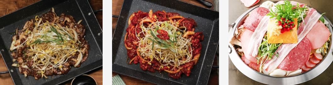 우삼겹 부대 두루치기 : 매콤한 특제 소스와 얇게 썬 우삼겹, 소시지, 신선한 야채가 들어가 자글자글 볶아지는 소주 안주
