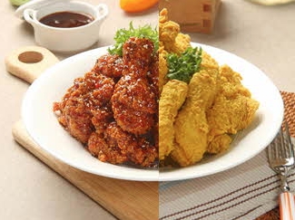 1980양념 반반 : 얇은 쌀튀김옷의 바삭한 켄터키 후라이드 반마리와 새콤달콤 1980양념치킨 반마리를 한번에!