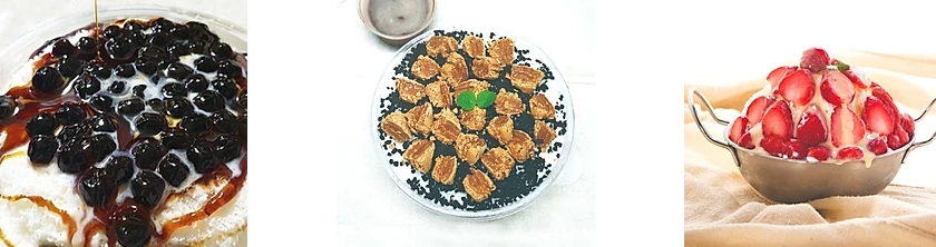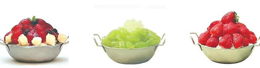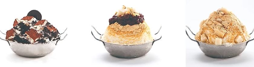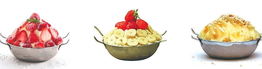 팥빙수 : 빙수의 정석! 우유와 정말 잘어울리는 팥을 사용하여. 고소달콤한 빙달콩가루와도 환상궁합.