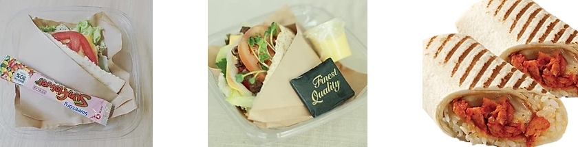피타 샌드위치(바질치킨맛) / 피타 샌드위치(숯불, 매콤달콤맛) / 핫치킨브리또