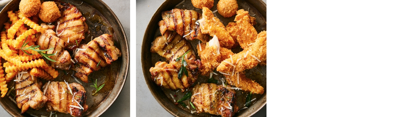 불맛이 살아있는 직화그릴드 닭다리살 통살과 최고급 후렌치후라이, 체다치킨볼이 함께 담겨있는 치킨박스