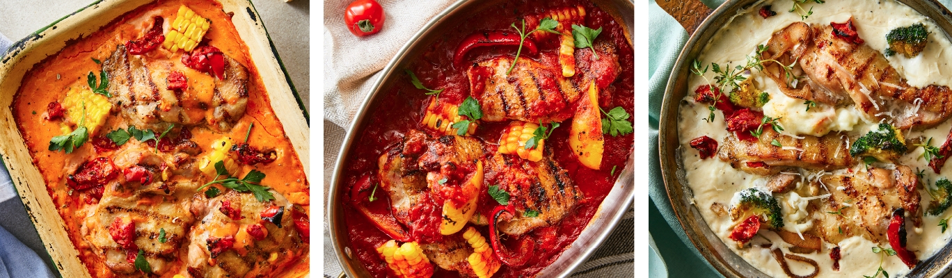 로제소스와 까망베르액상치즈에 직화그릴드 닭다리살 통살과 썬드라이드토마토, 옥수수, 모짜렐라치즈를 넣고