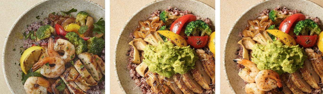 흑미밥에 직화그릴드 닭다리살 통살과 각종 구운 야채, 킹프론 3마리와 함께 아보카도를 으갠 과카몰리를 듬뿍 얹은 가장 건강한 프리미엄 치킨도시락