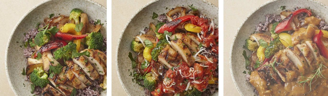 흑미밥에 직화그릴드 닭다리살 통살, 각종 구운 야채, 아라비아따소스를 얹어 매콤함을 살린 치킨도시락