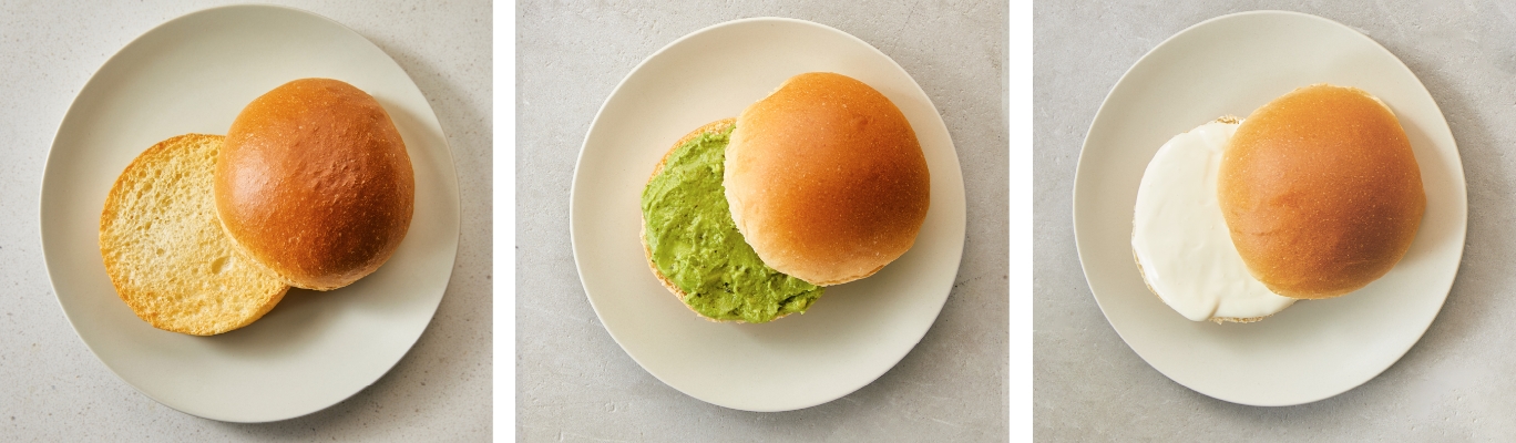 아보카도 해쉬 치킨버거 : 닭다리살 통살과 해쉬브라운의 고소한 맛과 과카몰리의 건강한 부드러움이 어울리는 치킨버거
