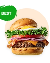 싱글 패티에 부드러운 달걀 프라이와 베이컨을 얹고 프레시 갈릭소스로 맛을 더한 버거