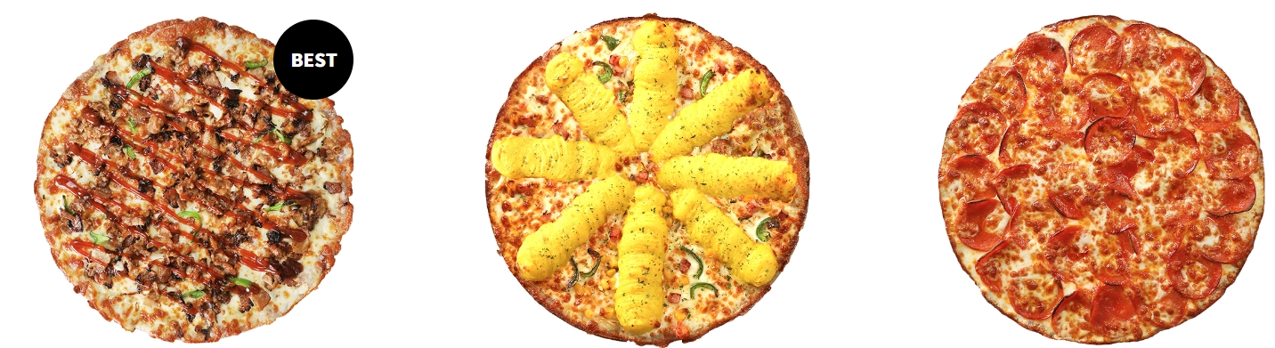 딥치즈베이컨피자 : 풍부한 치즈와 토마토소스, 풍미까지 더해져 특히 여성고객에게 인기만점 메뉴!