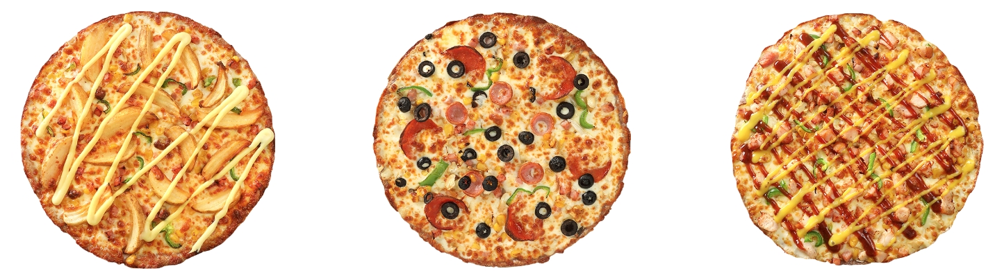 스페셜콤비네이션피자 : 파인애플, 페파로니, 햄, 미트볼, 베이컨, 양파, 버섯, 옥수수, 소시지, 피망 등 풍부하고 다양한 토핑으로 다채로운 식감을 즐길 수 있는 달콤한 올토핑 피자~